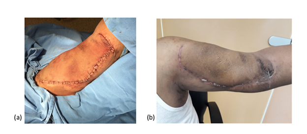 Figure 3 Successful vascular evolution in the immediate postoperative period. Figure 3a represents the left thoracic limb of the patient with a successful vascular evolution. Figure 3b represents the assessment of the patient 1 month after his surgery referring asymptomatic.
