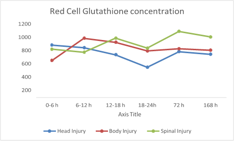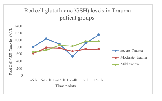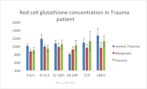 Results: Severe trauma was associated with significant increase in neutrophil count, and red cell glutathione depletion. Head injured patients also showed significant depletion of the red cell glutathione content more than other trauma Furthermore, plasma peroxide level peaked 12-18 hours post traumatic event.