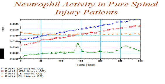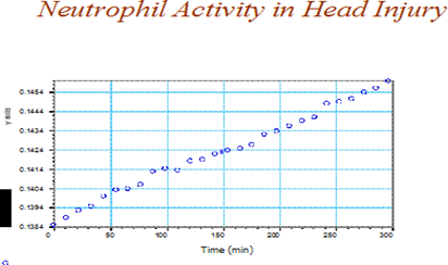 Effects of time and trauma location on neutrophil activityThe effects of duration and trauma location on neutrophil activity is shown in Figure 5 & 6. Neutrophil activity increased amongst the head injured versus the spinal injured (Figure 4). Additionally, neutrophil activity continued to increase over the duration of the study (Figure 5).