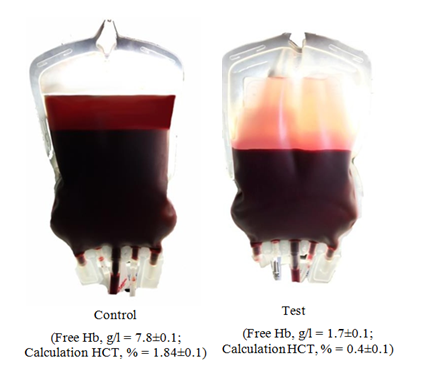 Figure 1 The hemolysis inhibition effect with using method of additive modernization of preservative solutions adapted to the manufacture process on the 35th day of the study.