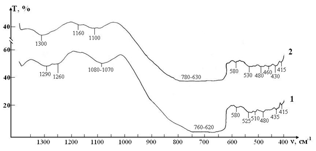 Figure 4IR absorption spectra of initial erythrocyte suspensions in the range 400-1300 cm-1: curve -control; curve 2-test.