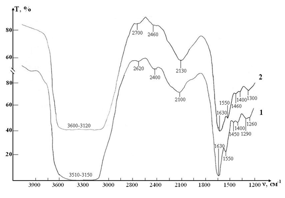 Figure 5 IR absorption spectra of initial erythrocyte suspensions in the range 1200-4000 сm-1: curve -control; curve 2-test.