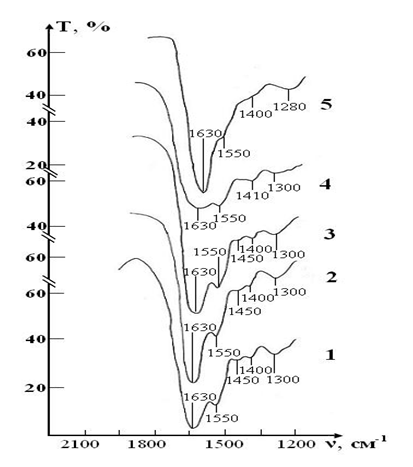 Figure 7 IR absorption spectra of a sample consisting of a suspension of erythrocytes in a saline solution treated with magnetite nanoparticles in CPD medium: curve 1- stage I (day 1) ; curve 2 - stage II (day 7); curve 3 - stage III (day 14); curve 4 - stage IV (day 21); curve 5- stage V (day 28).
