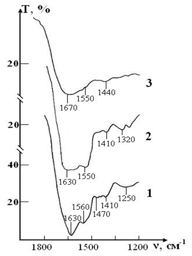 Figure 8 IR absorption spectra of the sample of control consisting of RBCs suspension in native saline solution in CPDA-1 medium on main stages of the study: curve 1- stage I (day 1); curve 2 - stage V (day 28); curve 3 - stage VII (day 42).