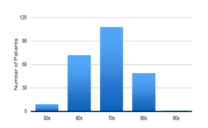Of the 239 patients undergoing EVAR during the study period, septuagenarians were the most frequent recipients, with a median age of 72.8 years at implant and a range of 53 years to 92 years old. Patients were divided in to each decade of life as follows, as summarized in Figure 2: heptogenarians 9 patients, hexogenarians 72 patients, septuagenarians 108 patients, octogenarians 49 patients, and a single nonogenarian.