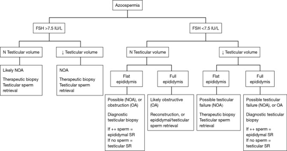 Figure 2 Courtesy.61 Flow chart depicting surgical management of the azoospermic patient based upon FSH and clinical examination. FSH and physical examination are two very important clinical features to determine if the etiology of azoospermia is likely NOA or OA. These findings help the surgeon to determine if a diagnostic or therapeutic testicular biopsy is required; or, if reconstruction or epididymal sperm retrieval is required. When assessing the epididymis, it may feel full & prominent indicating sperm may be present but block by obstruction, or, flat and subtle in which case it is less likely that sperm are present in the epididymal tubules; refer to Table 1 for an inclusive list of the other diagnostic tests important in initially assessing an azoospermic patient such as genetic testing, semen analysis volume & pH etc. NOA, non-obstructive azoospermia; OA, obstructive azoospermia; SR, sperm retrieval.
