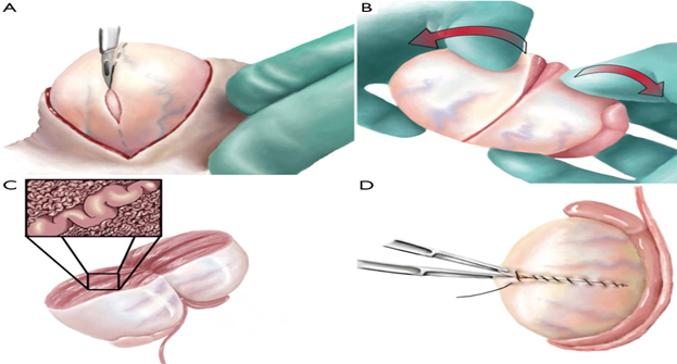 The advances made regarding Microdissection Testicular Sperm Extraction has been done for specializing beyond previously used either single site biopsies or multiple testis biopsies to Microdissection Testicular Sperm Extraction Figure 2. This aids in pointing the seminiferous tubule (ST) to be selected for increasing sperm collection, minimize surrounding testicular tissue loss, thus establishing the mTESE procedure. Originally Schlegel utilized a magnification that was six to 8times for initially identifying and subsequently preventing the compromise of blood vessels below the tunica albuginea once a large transverse incision is made over the tunica albuginea. Once ST’s were seen then for further enhancing their visualization the magnification was increased upto twenty- twenty five so that the ST’s within the most part of testis parenchyma were then seen, with bigger and more deeply coloured ST’s identified and subsequently sharply cut and separated. Thus less tissue was excised in contrast to the earlier large testis biopsy where larger incisions and more tissue were removed (9.4mg vis a vis720mg). Moreover SRR increased by 1.5 fold using mTESE as compared to standard TESE, and leading to 52% overall SR as quoted earlier in the published articles.2 Very few changes were made in the first technique described. A study of 900 men having NOA undergoing 1st attempt at mTESE was reported by Ramasamy et al.,13 in 2013. Of these men 474(52.6%) had successful retrieval of sperms on the 1st mTESE. 65% representing 308/474 of those had sperm found just on the initial large transverse incision alone, while in the rest 35% required to go in depth of the testis for SRR. Further they observed that reported that 8% or 40/506 patients who needed mTESE from both testis due to inability to retrieve sperms from the earlier side were successful in sperm retrieval on the contralateral side.13 If the original incision is not helpful in visualizing the entire testicular tissue of the testis and no sperm were retrieved, in view of dilated tubules(DT), or otherwise tubules with slightly larger caliber (SDT)(X24) than that of the surrounding. Caroppo et al.,14 conducted a retrospective study, in which they suggested to make a second large incision opposite to the original incision. With this technique in 42.8% i.e. 95of 222 patients they got SR. SR was successful in 90% of the testis with DT’s, in 47% with SDT’s and only in 7% of those with non dilated tubules(NDT). They for the 1st time proposed that spermatozoa might be retrieved even for slightly dilated tubules (Figure 3).14