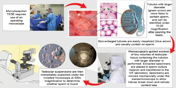 Figure 4 Courtesy.62 Microdissection testicular sperm extraction. The illustration depicts its main technical aspects, including the use of an operating microscope and the identification of enlarged seminiferous tubules, and initial processing of extracted specimens.