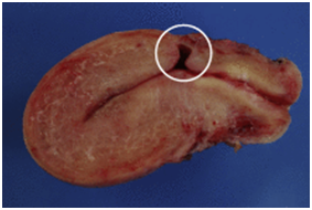 Figure 1 Courtesy ref no-6-Sagittal view of a frozen section from a hysterectomy specimen. A deep anterior defect covered with a thin layer of myometrium (white circle) can be observed at the level of the supposed site of CS.