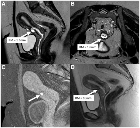 Figure 2 Courtesy ref 6-(A) Preoperative sagittal view of a T2-weighted image shows the residual myometrium (RM; white arrow) measuring 1.6 mm, covering a deep cesarean scar defect. (B) Preoperative transversal view of a T2-weighted image from the same patient. The RM covering the scar (white arrow) is very thin. (C) Sagittal view of a T1-weighted image with saturation of fatty tissue showing hypersignals (white arrow) inside the cesarean scar defect, suggestive of blood retention. (D) Sagittal view of a T2-weighted image after laparoscopic repair. The defect is no longer visible, and the RM at the level of the isthmus (white arrow) measures 10 mm.