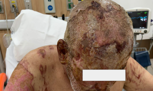 74-year-old male with third-degree burns due to immersion in high-density liquid over 41% of the total body surface. The patient was admitted to the hospital the same day of the accident, with lesions located on the thorax, face and back (Figure 1 & 2). The patient underwent surgery for debridement of devitalized tissue of the affected areas and they were covered with cryopreserved allografts of cultured epidermis 1:3 in anterior thorax - face and 1:6 in abdomen (Figure 3), the cultured epidermis allografts presented complete epithelialization at 10 days, ten days after the last surgical session, the grafted area had 88% epithelialization. Finally, the patient underwent a final surgical procedure to graft the residual areas.