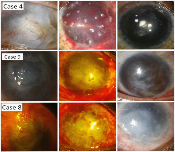 Figure 1 shows the pre-operative, post-operative day 1 and post-operative day 30 images of cases with successful (case4–top and case9–middle) and failure (case8–bottom) as clinical outcome. Though a successful outcome, the visual acuity in case 9 was limited due to corneal scarring. (I think you can mention this in legend rather than text)