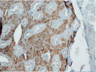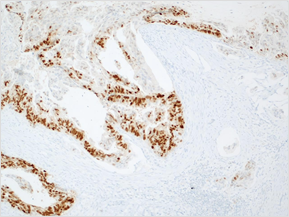 61 years old male who presented in 2020 with moderate lower urinary tract symptoms (LUTS) and PSA of 444 ng/ml. A prostate biopsy reported ISUP Grade Group 4 prostate adenocarcinoma and staging workup reported pelvic and retroperitoneal compromise as well as a superscan pattern in the bone scan. Androgen deprivation therapy was started. Patient had disease progression including skeletal events. Therefore, bilateral orchiectomy was performed. Surgical specimen histopathology reported left testicular involvement with prostate adenocarcinoma. Immunohistochemistry for CKAE1/AE3, PSAP, PSA came back positive. Subsequently, the patient expired due to an ischemic cerebrovascular accident (CVA) and infectious complications (Figure 4 & 5).