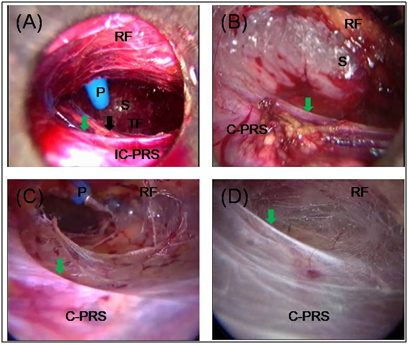 Figure 1 Single secondary arcuate lines as viewed in posterior rectus canal of 4 patients: (A) single well-defined secondary arcuate line (green arrow) and well-defined primary arcuate line in incomplete posterior rectus sheath (IC-PRS); (B & D) single Ill-defined secondary arcuate line (green arrow) in membranous complete posterior rectus sheath (C-PRS); (C) single well-defined secondary arcuate line in partly-tendinous complete posterior rectus sheath; RF, rectusial fascia covering rectus abdominis muscle; S, sign of lighthouse; TF, transversalis fascia; Black Arrow, indicates well-defined primary arcuate line; P, blue plastic working port11