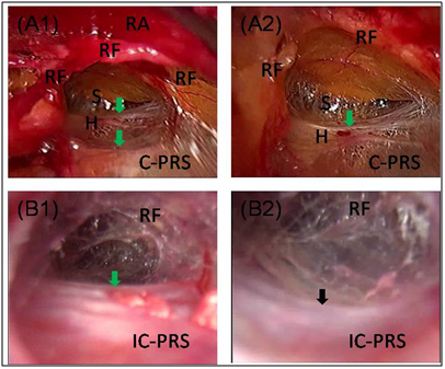 Figure 2 Double arcuate lines as viewed in posterior rectus canal of 2 patients: (A1 & A2) Double arcuate lines (green arrows) in grossly attenuated complete posterior rectus sheath (C-PRS); (B1 & B2) Secondary arcuate line (green arrow) and primary arcuate line (black arrow) in partly-tendinous incomplete posterior rectus sheath (IC-PRS); RF, rectusial fascia covering rectus abdominis muscle (RA); S, sign of lighthouse; H, Henle’s Band;11