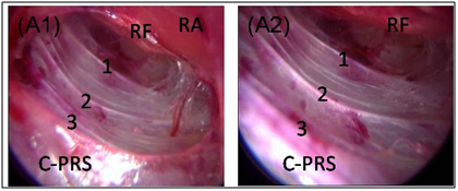 Figure 3 Triple arcuate lines as viewed in posterior rectus canal of a patient: (A1 & A2) Triple arcuate lines (1, 2, 3) in partly tendinous complete posterior rectus sheath (C-PRS); RF, rectusial fascia covering rectus abdominis muscle (RA)11