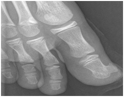 A 12-year-old boy presented at our Institution with right toe pain and swelling with six months of evolution. The patient also presented a progressive increase in pressure sensation. He had no history of trauma prior to the emergence of the symptoms. On physical examination, the terminal extremity of the second toe was swollen, without any other signs such as heat or erythema. The nail plate was elevated, hyperkeratotic and thickened. The toe mobility, sensibility and vascularity were normal. Radiographs showed a heavily calcified mass on the terminal phalanx of the first toe, which was attached to the underlying cortex (Figure 1). There were no signs of periosteal reaction and no alteration of the underlying bone to which the lesion was attached. In this sense, a presumptive diagnosis of subungual exostosis was made and we decided to perform its surgical resection. We decided to perform a subungual approach, lifting the nail plate, which allowed a dorsal view of the terminal toe phalanx. An “en-bloc” resection of the lesion and a decortication of the underlying bone were performed. We have also removed the portion of the nail which presented alterations.