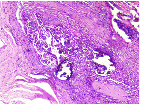 Figure 1 Microscopic examination shows a multiloculated cystic lesion with variable sized thyroid follicular epithelial cells and foci of calcification. Focal areas of cellular a typical was noted within tumor cells exhibiting ground glass nuclei. Hematoxylin and Eosin x10X.