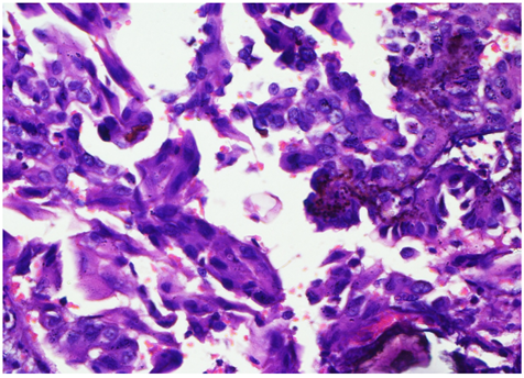 A 47 year old male came to the Surgical Clinics with complaints of progressively increasing midline neck swelling for the last 4 years. He had no history of pain, dysphasia, hoarseness of voice, fever, loss of appetite and loss of weight. He also had no history of any systemic illness and family history. On examination, a well-defined cystic, non tender, swelling, 8 cm×6 cm in size was seen in the mid of the neck. The overlying skin appeared to be normal with no signs of sinus or fistula. The mass was fixed to the underlying structures, was compressible, non-pulsatile, non-fluctuant and moving with deglutition. No neck nodes were palpable. A provisional diagnosis of a thyroglossal cyst was given. Fine needle aspiration cytology showed features of a cystic lesion. X‑ray chest was normal. On ultrasonography, a large lobulated cystic mass with hyper and hypoechoeic areas with focal calcification was seen. There was no abnormality detected in routine hematologic and urine investigations. Surgical excision of the cystic swelling with sistrunk’s procedure was performed. Grossly, the specimen was 10.4cm×6cm×3.8 cm in size, with multinodular and well capsulated external surface. Cut section showed a multiloculated cystic swelling with foci of solid grey white areas with focal papillary excrescences. Microscopic examination showed a multiloculated cystic lesion with variable sized thyroid follicular epithelial cells and foci of calcification. Focal areas of cellular atypia was noted within tumor cells exhibiting ground glass nuclei Figure 1 & 2. Immunohistochemical staining showed diffuse moderate intensity cytoplasmic positivity of Pan Cytokeratin Figure 3. A histopathologic impression of papillary carcinoma of thyroid in a thyroglossal cyst was made. Postoperative period was uneventful and our patient was absolutely all right. 50 Gy of Co-60 radiotherapy and adjuvant chemotherapy with Cisplatin 50mg/m2x6 cycles was administered. Our patient is doing well after 12 months of follow up.