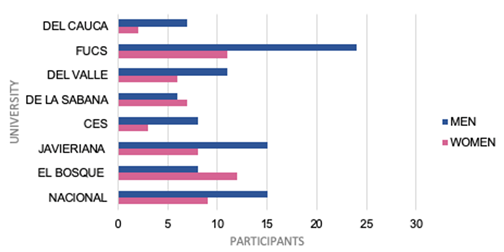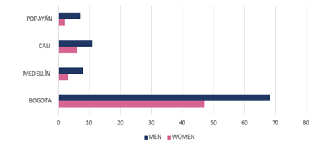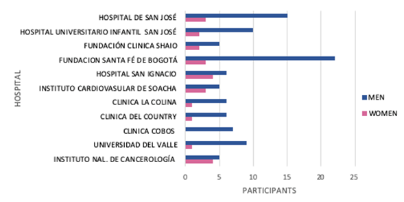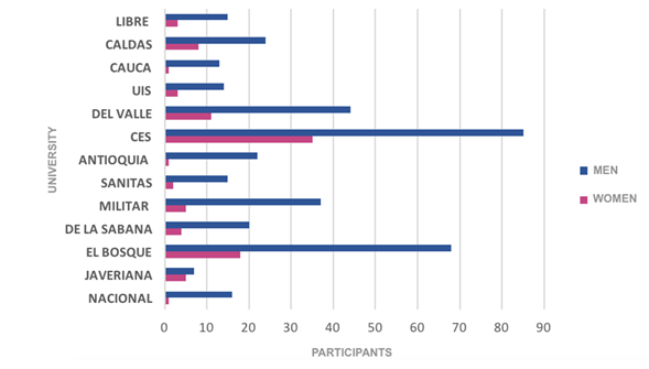 The members attached to the Colombian Association of Surgery conducted a survey to investigate the participation of women in general surgery residency programs and their main university hospitals nationwide, for the second semester of 2020. The survey evaluated the following variables: academic program, university hospital, city, gender, academic position (resident) and clinical instructor (institutional surgeon of the university hospital). The data collected protects the identity of the participants, and they were informed of the purpose of the study and their participation was voluntary.