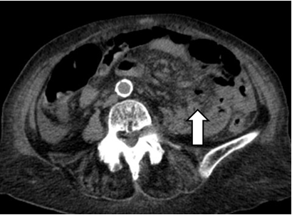 101-year-old female without history of gastrointestinal symptoms, debuted with periumbilical abdominal pain and generalization of pain, accompanied by nausea, headache, and diarrhea for 4 days. Physical examination showed hypotension and tachycardia, chills, asthenia, adynamia, intense abdominal pain, tenderness, and stiffness. Laboratory tests showed diminished white blood cell count (3.07x109uL), procalcitonin level elevation, metabolic acidosis, and elevated lactate. Abdominal CT scan revealed pneumoperitoneum, free abdominal fluid and whirlpool sign at jejunum (Figure 1 & 2). Exploratory laparotomy was performed, finding 1000 ml of intestinal fluid, jejunal diverticulum of 6x4 cm, 50 cm distant from the Treitz angle, with perforation of 1 cm (Figure 3), and multiple distal diverticula. She was managed with intestinal resection and anastomosis. She was discharged from the hospital 7 days after the surgery. Diagnosis was confirmed by pathology report (Figure 4 & 5).