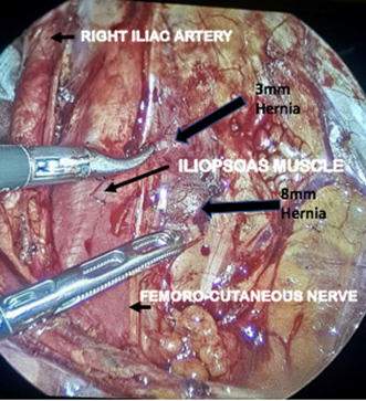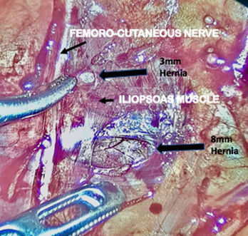 Case 1: A 42-year-old female patient with no significant personal or family history, began with pain in the right inguinal region radiating to the right buttock. She referred also paresthesia in the thigh with physical effort. It progressively became intense and constant, until she reported 8/10 on the visual analogue pain scale. She consulted an orthopedist who ruled out a musculoskeletal problem, and later the patient was seen by us. Her laboratory tests showed no abnormalities. The ultrasound reported a femoral hernia on the left side and no perceptible hernia defect on the right side. Laparoscopy was performed to repair the femoral hernia and explore the right inguinal region. A TAPP-type (Trans abdominal preperitoneal) dissection of the right inguinal region was performed, finding two hernia holes on the iliopsoas muscle. One 0.3 cm. and the other of 0.8 cm, lateral to the psoas muscle, very close to the lateral femoro-cutaneous nerve; both with incarcerated preperitoneal fat (Figure 1 & 2). No other hernia orifices were found in the right inguinal, femoral, or obturator region. Herniated preperitoneal fat was released. An infiltration of anesthetic solution with alcohol as neurolytic was applied, in the muscles of the area. A polypropylene mesh was applied, closing the peritoneum with running suture. On the left side, the femoral hernia was repaired in the usual way. The patient reported total relief of the pain. During the follow-up at one week, two weeks, a month, up to six months after surgery she remained asymptomatic.