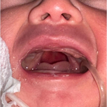 Clinical case: Full-term male neonate shows signs of gastroesophageal reflux during breastfeeding and alteration in the palate, which is why they request an evaluation by the Plastic and Reconstructive surgery service. At the physical examination, adequate mouth opening is evident: a palatal cleft is visualized that involves the hard and soft palate of approximately 25 x 30 mm, which allows visualization of the posterior surface of the pharynx. Absence of choanae with hypoplasic tongue. Suction reflex preserved with decreased pressure. Findings are complete palatal cleft, microglossia and micrognathia.