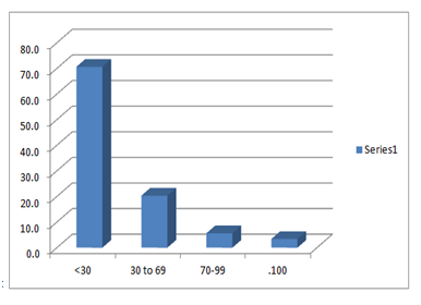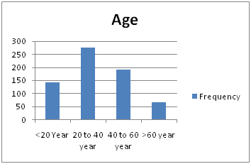 The percentage of the Age of the patients ranges from 20 age group to 70 years .We divided into four groups age group of up to 20 years, 20-40 years, 40-60 years and 60 plus years (Figures 2 & 3).The value of less than 20 years of patients were 142 patient, 20 to 40 years of age were 275 and 40 to 60 years were 191 patients and more than 60 years of age were 66 patients. In term of percentage the value of less than 20 found in 21 patients, the 40.8 found in group of 20-40 years, and 28.9 in 40 to 60 years of group of patients more than 60 years were 9.8 in percent (Figures 4 & 5).