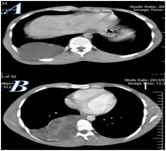 A 19-years-old Iranian male patient was referred to our department in 2011 with history of gradually onset of right chest wall swelling with pain since seven months ago. The patient was living in the rural part of Guilan province in north of Iran. He had not any history of medical or surgical problems. Physical examination showed a localized swelling over the back on the right chest wall without tenderness on palpation (Figure 1). The patient’s laboratory findings were within normal limits. Chest X-rays showed a mass lesion on right hemi thorax with an osteolytic lesion of the 7th rib. Contrast enhanced CT scan revealed a multi loculated mass lesion with septations and enhancement over visceral pleura at the posterior side of thorax that destructed right seventh rib and extended to posterior mediastinum and chest wall (Figure 2). Cystotomy and partial resection of the seventh rib were performed via a right posterolateral thoracotomy. Daughter cysts were seen when the lesion was incidentally opened (Figure 1). Albendazol (800mg daily) was administered for three months postoperatively. Histological findings had confirmed the diagnosis of hydatid cyst. There weren’t any complications during the postoperative period and the patient was discharged at postoperative 5th day in a state of complete recovery. In 1-year follow-up period he was in good condition without recurrence of the chest wall mass.