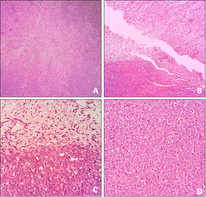 Figure 4 Basic staining study. A) Malignant neoplasm of mesenchymal origin forming sheets of small spindle cells intercepted by delicate fibrovascular septa and focal coagulative necrosis (HE, 4x). B and C) Cellularity is marked, although hypocellular areas with a loose and edematous appearance are also identified (HE, 4-40x). D) The neoplastic cells are round, elongated with scarce cytoplasm, and poorly defined; the nuclei are monotonous with mild pleomorphism, fine chromatin, and frequent mitoses, including atypical forms (HE, 40x).