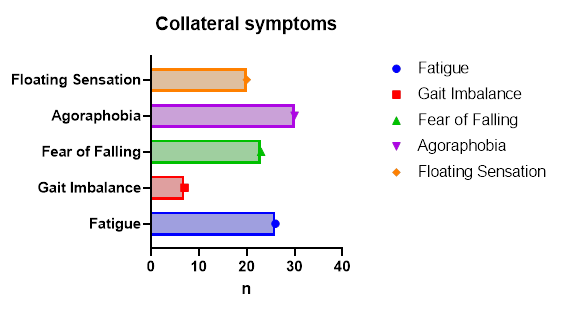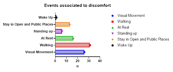Some specific events may cause discomfort in patients with PPPD including visual movements (n=26), walking (n=31), at rest (n=16) and stay in open and public places (n=13). Other events associated with discomfort in PPPD patients described were waking up and standing up (Figure 2). Patients referred other collateral symptoms to those commonly described in PPPD. Floating sensation (n=20), agoraphobia (n=30) and fatigue (n=26) were commonly described. Others reported were fear of falling and gait imbalance (Figure 3).
