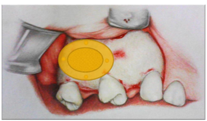 After drilling to insert the material that will fill the internal cavity of the maxillary sinus (Figure 2) fits the chosen membrane, either absorbable or non absorbable (Figure 3). And it will be sutured with absorbable wire using the holes previously made (Figures 4&5).