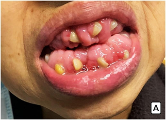 50 year-old female patient, who consulted for gingival enlargement, which started about 5 years ago. Patient with a history of convulsive disorder treated with phenytoin 300 mg per day for 42 years, with no other history of importance. On physical examination, the oral cavity showed incomplete dentition, tartar accumulation, bacterial plaque, gingival overgrowth partially hiding the dental crowns, shaped as globular masses, with preserved mucosal texture and firm consistency. Partially occluded oral cavity, with sialorrhea (Figure 1).