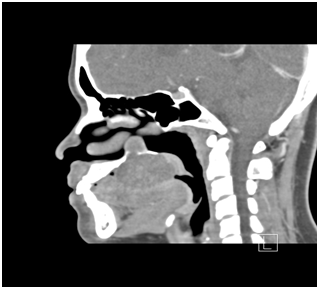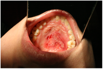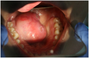 A 23 years old female presented with slow growing swelling of approximately 4 years of duration involving her hard and soft palate junction on the right side. The swelling was peanut size when she first observed. However as lesion had always been asymptomatic with no associated pain or paraesthesia the patient had neglected it. She only sought medical help when it started obstructing her speech and eating. The patient’s medical history was noncontributory. She had no known allergies and not undergone any surgeries of head and neck. Clinically the patient presented with typical ‘Hot potato in mouth’ speech. Inspection of the lesion revealed ulcerated dome shaped palatal swelling of size about 5x4 cms in the posterior part of hard palate right side extending on to the soft palatal junction crossing the midline. The overling mucosa was red and stretched and presented as a single mass without any nodules. The lesion was firm non tender and not blanching to pressure on palpation (Figure 1).