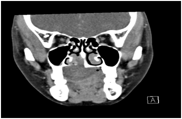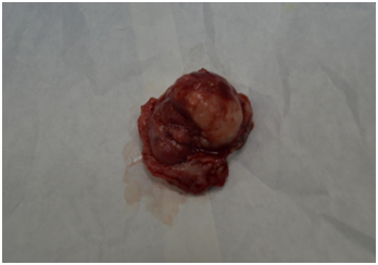 CT Scan of the maxilla revealed erosion of the right half of the hard palate with intranasal extension into the floor of the right nostril with erosion of the adjustant part of the medial wall of the right maxillary antrum upto the base of pterygoid plates and medially the inferior part of the bony part of the nasal septum on that side (Figure 2 & 3). The soft palate was pushed in to the oropharynx. Punch biopsy was taken which suggested Myoepithelioma of minor salivary gland. All preoperative blood and urine investigation was done which were within normal limits. The patient was intubated nasally with endotracheal tube and wide local excision of the mass was done. The tumor was dissected from the nasal mucosa. The excised mass was about 4.5x 3 x2.5cms (Figure 4) and send for histopathological examination. An obturator was given postoperatively.
