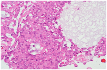 Microscopic examination showed well encapsulated tumor composed of sheets and islands of monomorphic round to polygonal cells with eccentrically placed plasmacytoid nuclei and abundant glassy eosinophilic cytoplasm lying in myxomatous stroma. No mitosis or necrosis seen. (Figure 5 & 6) Immunohistochemistry for Vimentin, CK, S100, CK7 were positive and the final diagnosis was Myoepithelioma-Plasmacytoid variety of minor salivary gland.