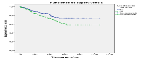 Results: When comparing the survival curves according to the location of the tumor, it was found that those who had undergone surgery for a rectal tumor had a significantly lower survival during complete follow-up than patients with tumors in the rest of the sites (p=0,032). Significant differences were also found in the survival curves regarding the stage of the disease; stage IV patients showed the worst survival during the follow-up of this series.