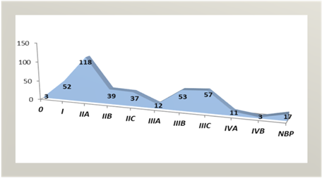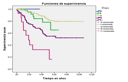 Between 2005 and 2015, 402 resections were performed due to colorectal cancer and the survival rate was studied. The average age of the patients was 66,6±12,4 years, and there was a slight prevalence of females 210 (52,2 %) over males 192 (47,8 %). Average age was similar in both genders (females: 66, 4 years males: 66, 9). Preoperative diagnoses and the techniques utilized are shown in Table 1. Rectal cancer represented 43% of the preoperative diagnosis, followed in frequency by those located in the right colon and sigmoid. The most utilized surgical techniques were anterior resection of the rectum (Dixon), right hemi colectomy and sigmoidectomy, Abdominoperineal resection following Miles technique represented 7% of the procedures performed and rectal surgery 16% Table 2. In regards to staging based on the TNM classification, our study shows that 75,4% of the patients were in stages II and III and only 19,4% were in stage I. Staging was not possible in 17 cases because the biopsy report did not have all the required data Graph 1. The maximum follow-up time was 10, 7 years. From a total number of 402 patients who had surgery for colorectal cancer 89 died, representing 22,1 % of the patients studied. There was an overall survival rate at 5 and 10 years of 70,9 % and 66,8 % respectively, as shown in Table 3. The research was restricted because of the inconvenience of not being able to determine the date of recurrences or metastases. That is the reason why we only present the distribution of absolute and relative frequencies of these variables without being able to determine survival free from progression or disease. Loco regional recurrence was present in 2, 5% of the patients (10 cases), and 14,4% (58 patients) had distant metastasis. Port site metastases in the abdominal wall occurred in two cases (0,49%). When comparing the survival curves by tumor location, it was found that those with rectal tumors had a significantly lower survival during follow-up than patients with tumors in other sites. (p=0,032). Significant differences were also found in the survival curves based on the stage of the disease: stage IV patients showed the worst survival during the follow-up of the series. (p=0,000) (Figures 1&2).