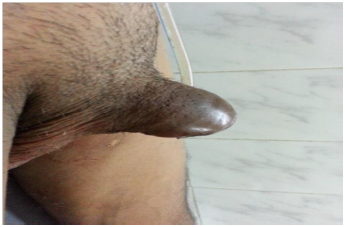 A 75year old male, farmer and a heavy smoker (40 to 50 cigarettes in a day from the age of 20yrs) was referred to our institute with the complaint of gross total painless intermittent hematuria for one month. On examination pre-puce was not retractable and though meatus could be seen through pre-pucial opening. Palpation revealed that there was a growth over the glans, which the patient was unaware of (Figure 1). Concomitantly, multiple inguinal lymphadenopathy was present, the largest node being 2cm in size on right side. Skin over the nodes was normal. The patient had suffered lower urinary tract symptoms over the preceding 1 year and seemed cachectic, but had not previously reported weight loss or any other specific complaints. He did not have a family history of malignancy, or any other history of medical of surgical treatment in the past. USG of the abdomen revealed a growth found on postero-lateral wall of bladder. CECT (Contrast enhanced computed tomography) abdomen and pelvis advised to patient. On CECT a 4×3cm mass was present over right Postero-lateral wall (Figure 2). After completing the preoperative workup the patient was planned for penile growth biopsy and cystoscopic biopsy of bladder tumour. Dorsal slitting was done before cystoscopy and biopsy taken from bladder mass. After that biopsy was taken from the penile growth. Fine needle aspiration of the inguinal lymph nodes was also done. Bladder biopsy revealed a Low grade Transitional cell carcinoma a with no muscle invasion seen on biopsy specimen. Penile growth biopsy showed a moderately differentiated squamous cell carcinoma. FNAC(Fine needle aspiration cytology)of in guinal lymph nodes came out as non-specific reactive lymphadenitis.