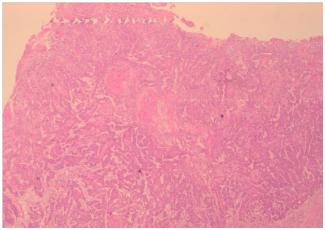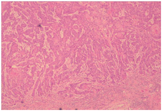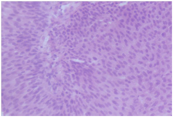 The patient was then planned for a partial penectomy along with transurethral resection of the bladder tumour. The patient underwent a partial penectomy (Figure 3) along with transurethral resection of the bladder tumour. The pathology results from the TURBT (Transurethral resection of bladder tumour) revealed a low grade transitional cell carcinoma, with no muscle invasion (Figures 4 & 5). Penile resection specimen showed a moderately differentiated squamous cell carcinoma with no lympho vascular invasion with the re-sected margin being negative for tumour (Figures 6 & 7). The TNM stage of the penile and bladder tumour was T1N0M0 and T1N0M0, respectively. The final diagnosis was double primary cancer of the penis and bladder. The follow-up check Cystoscopy and CT scan of the abdomen and pelvis done six months after the operation showed no evidence of recurrence. The inguinal lymphadenopathy too subsided post-operative lyon antibiotics treatment, presumably being reactive in origin. Patient reports no lower urinary tract symptoms and has good stream and minimal post void volume.8