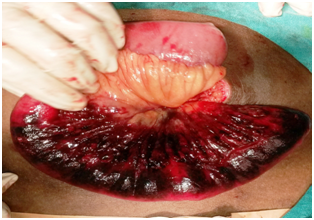 A patient named y, 45 years, male, presented to the emergency department, referred from a primary health centre, with the history of animal bite injury to the anterior abdominal wall. He gave the history of wild animal bite to the anterior abdominal wall, while, he went to the forest to fetch burning wood. On examination the condition of the patient was stable. The blood pressure was 100/70 mm, pulse around 100/minute. On local examination, there was a lacerated wound in the anterior abdominal about 2-3 cm below the umbilicus and from the wound, there was prolapse of loops of small intestine. The prolapsed loop was measuring 10 inches long, brown-black in color with no visible peristalsis. An emergency laparotomy was planned. The basic investigations carried out. Preoperative workup consisted of IV fluids, antibiotics, Anti-rabies vaccination and analgesics. The peritoneal cavity opened by extending the lacerated wound on the anterior abdominal wall. It was found that a loop of small intestine, around 10 inches long, was caught and strangulated in the narrow wound of the anterior abdominal wound. The small intestine traced and inspected from DJ junction to Ileo-caecal valve. A loop of it, in the mid-small intestine, was found strangulated. The distinction between viable and non-viable part established. The non-viable and strangulated bowel excised, and end- to- end anastomosis done. Recovery was uneventful and the patient was discharged on the tenth postoperative day after removal of stitches (Figure 1).