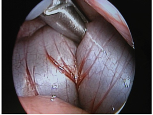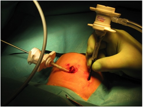 A skin incision is made at the site chosen for the colostomy on the abdominal wall. A second troacar of 5 mm is placed under laparoscopic visualization, and a grasper is introduced through this port (Figure 1). With the help of the grasper and by using varying patient positioning, the abdominal cavity and internal organs can be fully visualized. The internal genitalia can be inspected, in order to secure that both ovaries and uterus are identified and to rule out duplex uterus, single or none ovaries or undescended testes.