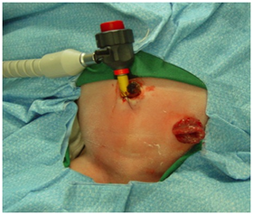 The grasper is used to hold the part of the colon chosen for the stoma, which is pulled up to the trocar (Figure 2); the trocar is then withdrawn. The grasper is used to bring the bowel out through the abdominal-port opening. After displacing the marginal artery, the colon is divided outside the abdominal cavity. The effluent is suctioned away to prevent peritoneal contamination. This step decompresses the intestine, giving the neonate enough relief and relaxation for completion of the procedure. The decompression also creates space for further examination of the bowel and other abdominal structures.