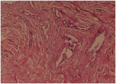 A 19-year-old female student visited the outpatient gynecology clinic with complaints of pruritus vulvae for 3 years. The itching was intense enough to wake up the patient at night. She denied of any vaginal discharge and was not sexually active. She also had history of chronic rhinitis. She took treatment off and on in the form of topical and systemic antibiotics, antifungals, antihistaminics and steroids, but was not relieved although the patient reported spontaneous remissions. Physical examination revealed a 0.5 x 1 cm dry patch on her vulva. There were no nodules present either on the vulva or anywhere on the body. As the patient had already taken treatment for 3 years without any relief, so a decision for vulval biopsy from the identified patch was taken. Histopathological examination showed hyperkeratosis with focal epithelial hyperplasia and mild mononuclear infiltrate in upper subepidermal region with fibrocollagenous stromal dermis. (Figure 1). There was marked degree of hyperplasia of cutaneous nerves and neuroid structure with collagenization of the dermis (Figure 2). No other specific pathology was noted. S-100 immunostain revealed an increase in number and size of cutaneous nerves throughout the dermal zone. She was prescribed topical emollients and corticosteroids along with habit reversal therapy and was referred to a dermatologist.