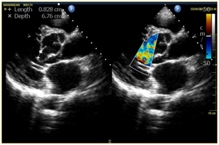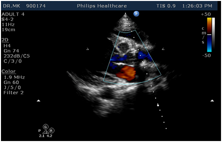 Figure 3 Postoperative Echo demonstrating no residual Rupture of sinus of valslava with well functioning mechanical valve in the aortic position.