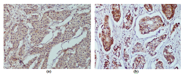 Figure 1 Representative images of uPA, as determined by immunohistochemical staining (x400). uPA exhibited of cytoplasmic immunoreactivity: a) Weak b) Moderate.