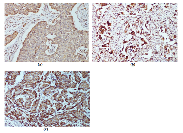 Figure 2 Representative images of VEGF, as determined by immunohistochemical staining (x400). VEGF exhibited variable levels of cytoplasmic immunoreactivity: a) Weak b) Moderate, c) Strong.