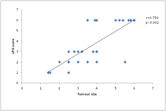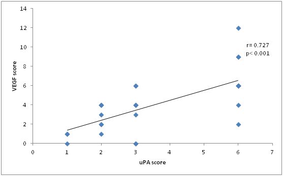 Results: A total 30 histologically proven early breast cancer patients were included in the study with a mean age of 49.53±9.702 years (range 30-65 years). uPA was expressed in 90% of patients with a mean uPA IRS (immunoreactive score) of 3.567±1.85.The mean VEGF immunoreactive score was 4.16. The uPA expression was significantly associated with T-stage (p<0.001), axillary node (p=0.029), grade of tumor (p=0.028) and lymphovascular invasion (p=0.002) respectively. The positive correlation was found between uPA IRS score and larger tumor size (r=0.727, p<0.001) and number of positive lymph nodes (r=0.466, p=0.009). The correlation between uPA IRS with VEGF IRS was also found to be significant positively correlated (r=0.727, p<0.001).
