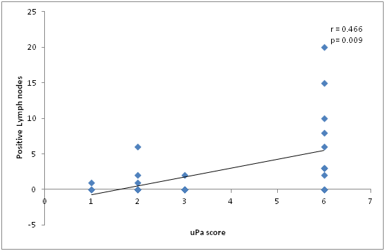 Antiangiogenic therapy is a hot cake in modern oncology because most of the angiogenic ligands and receptors are functionally active in tumour mass progression and can share some combinative actions with lymphatic vessels growth. Consequently, the rationale for anti-angiogenic therapy can favour the cessation of lymphatic vessels development, which in turn potentially hampers the metastatic budding of the tumor cells.25 Angiogenesis is seen to be dependent on uPA expression in breast cancer hence anti angiogenic therapy could be a potential tool in treatment and prevention of locoregional spread and distant metastasis in patients having higher uPA expression. uPA expression has shown positive correlation with Lymph node spread in various studies including the present study. Lymph node metastasis is single most established poor prognostic marker in breast cancer patients. This important tool is missing in node negative breast cancer patients who may be having histologically undetectable nodal metastasis. uPA expression can serve as surrogate marker for potential nodal recurrence in such subset of patients. The limitation of present study is small sample size which is the probable reason for not having significant association and correlation of few of the established prognostic parameters. The positive results of remaining prognostic parameters qualifies the present study to be a stepping stone towards a larger combined retrospective and prospective study to have a better insight Figure 5.