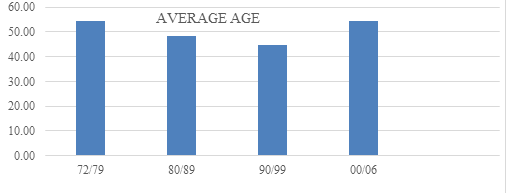 After a thorough survey of records of each female patient we identified in each of nearly four decades of the study, the average age of all 958 women who joined the program (Graph 1) was 50 years old. It is surprising to find that, although aging and sedentary lifestyle is important risk factors for coronary disease and responsible for a high mortality rate among women, this was the mean age of greatest adherence to the CPRP. Between 1972 e 1979 there were few adhesions and the average age was 55 years old. Important to point out that, in the two intervening decades (between 1980 and 1999), when a greater number of women joined the CPRP, the average age was even lower, between 45 and 50 years old, and PG stood out with greater adherence of women.